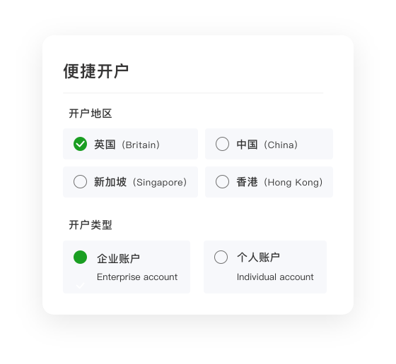 支持大陸/香港/英國/新加坡企業(yè)、個體戶開戶,全流程線上操作,無需銀行排隊