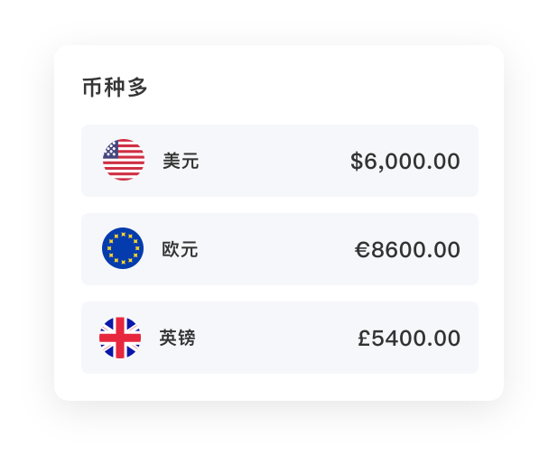 支持美金、歐元、英鎊、日元、加幣、澳元等18國幣種收付款